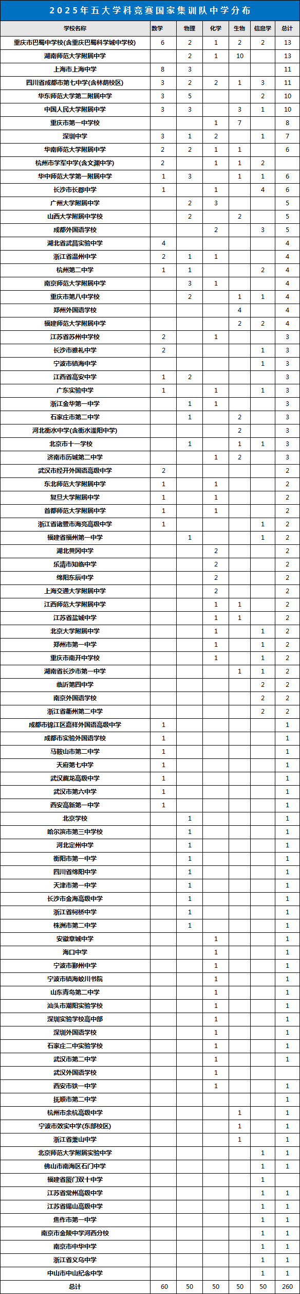 进入五大学科竞赛国家集训队的260名考生(数学竞赛60人,其他竞赛各50人),可以直接获得保送清华、北大的名额。以下则是2025年国集的完整名单,及各省份、中学分布情况: