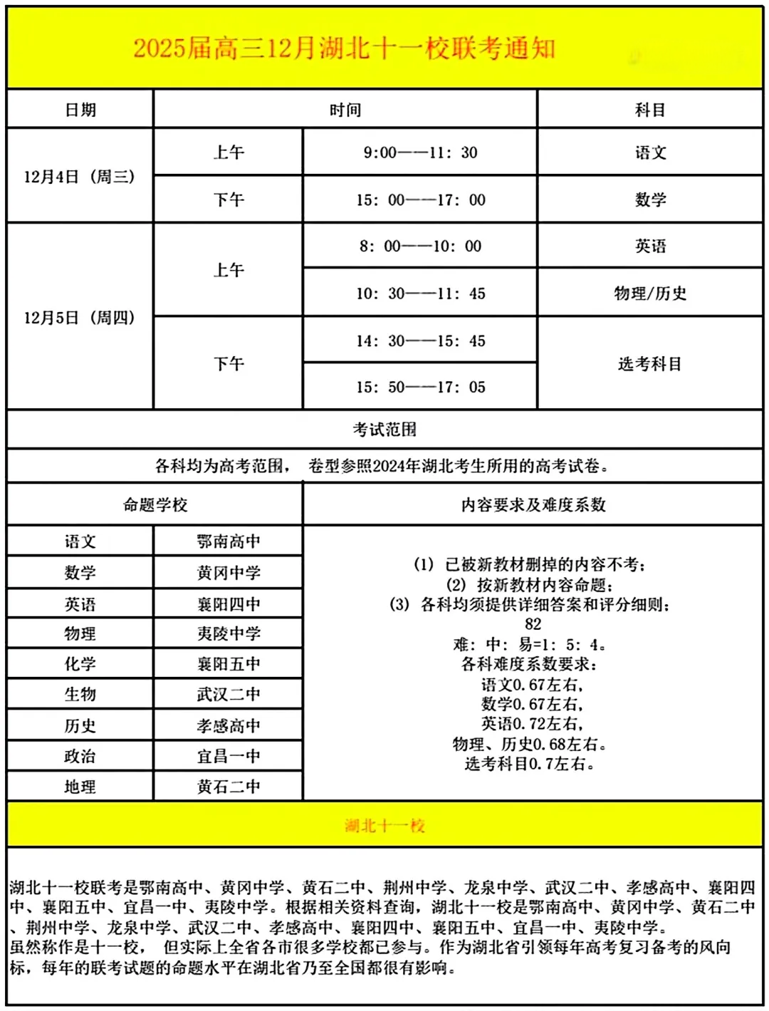 湖北省十一校2025届高三第一次联考安排在12月4日-12月5日进行。