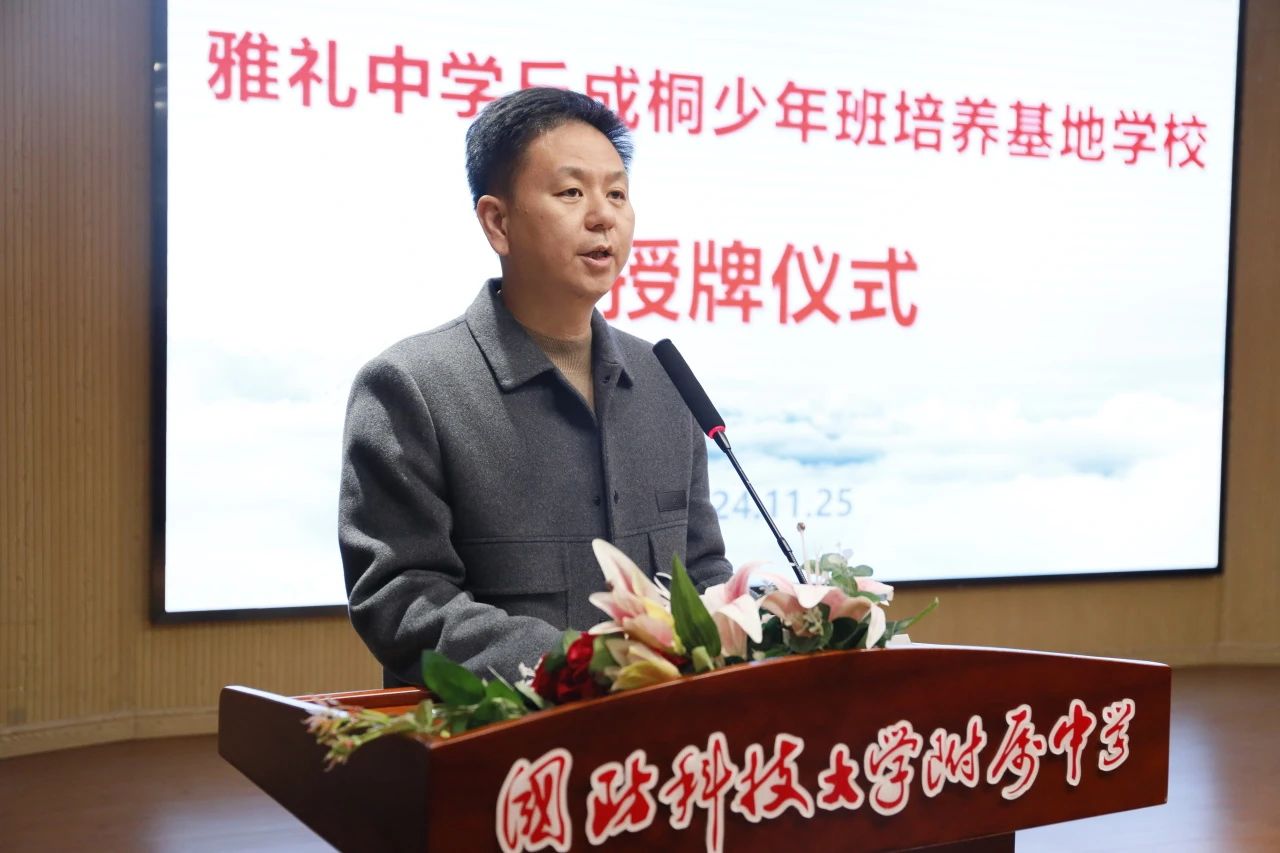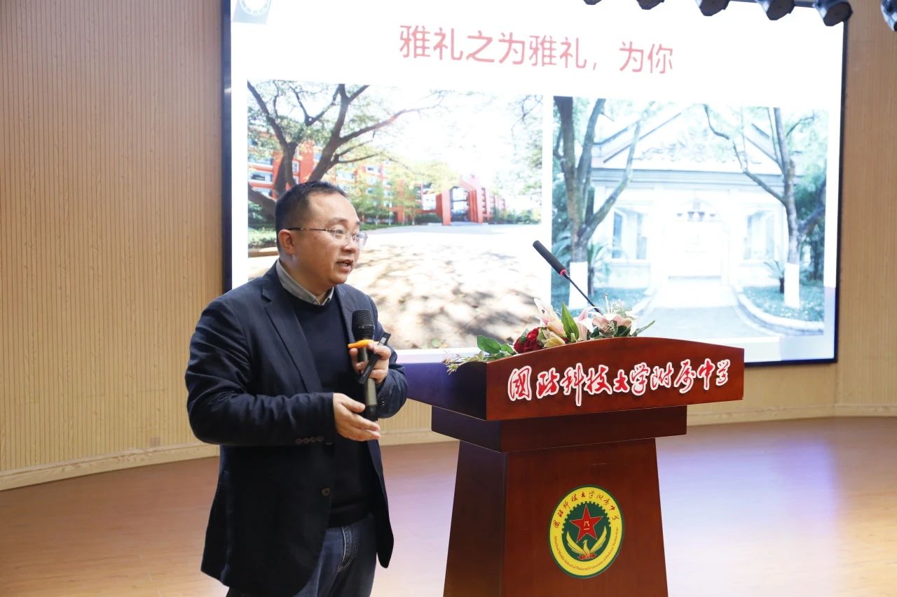 最后,雅礼中学副校长王良在仪式上讲话。他介绍了几位在雅礼中学就读的科大附中优秀毕业生的风采,对国防科大附中近几年来所取得的成绩表示祝贺。他指出,拔尖创新人才的培养需要更多学校的积极参与,要为学生提供更专业、更系统的学习研究平台,助力学生成长为具有国际视野和创新能力的优秀人才。