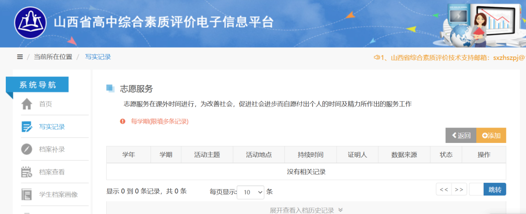 在填写完信息后,进去首页,学生可以在页面中查看个人的基本信息,往后需要包含思想品德、身心健康、艺术素养、社会实践在内的写实记录模块:以及学生档案画像、自我陈述等。