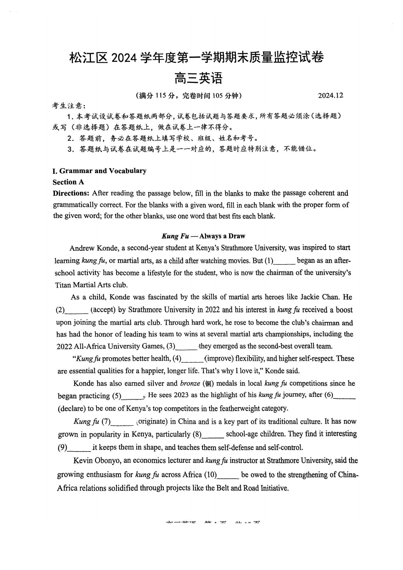 上海松江区2025届高三一模于12月4日开考,易单招网小编整理上海松江区2025届高三一模英语试题,欢迎考生下载学习。上海松江区2025届高三一模英语试题及答案