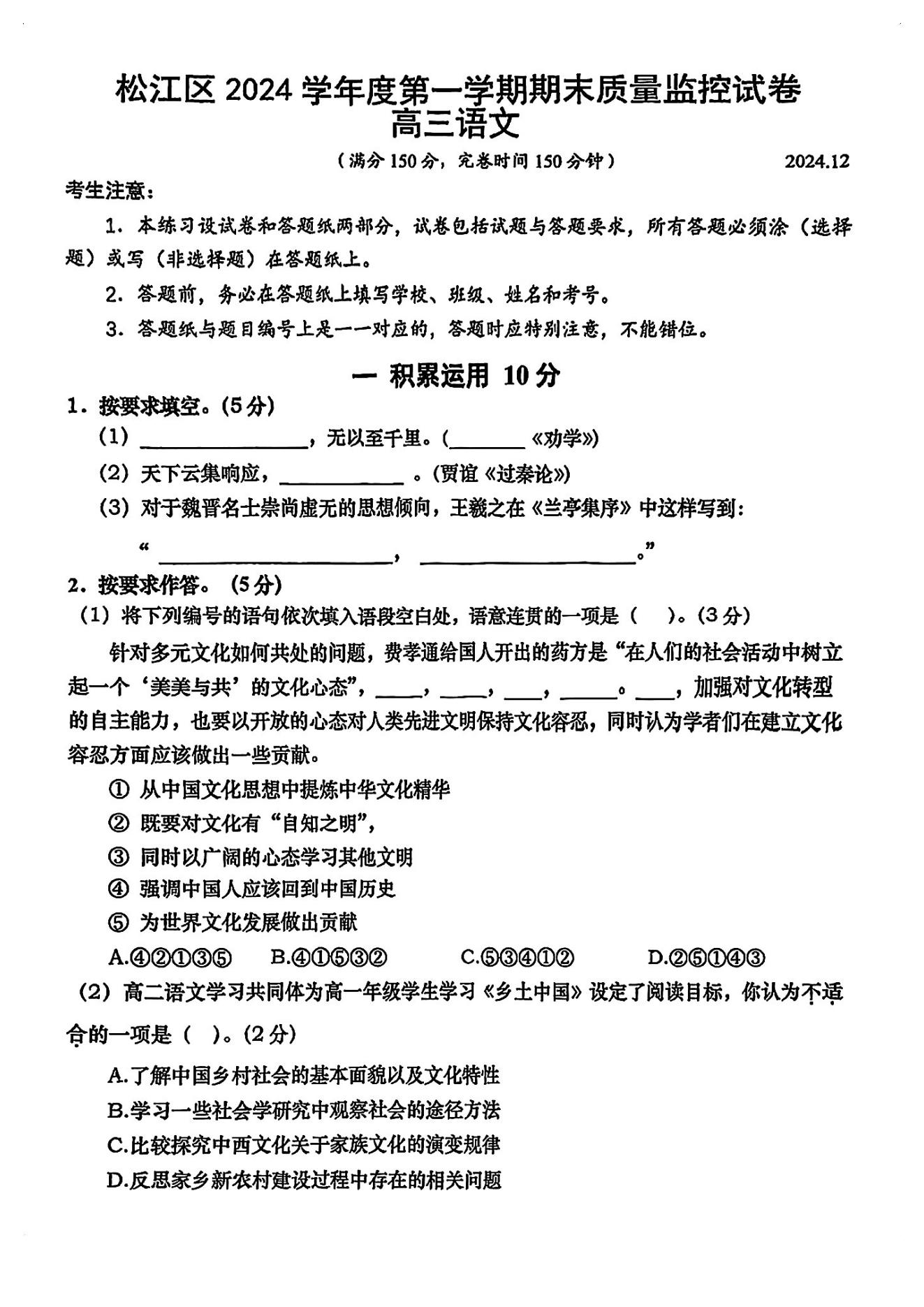 上海松江区2025届高三一模于12月4日开考,易单招网小编整理上海松江区2025届高三一模语文试题,欢迎考生下载学习。上海松江区2025届高三一模语文试题
