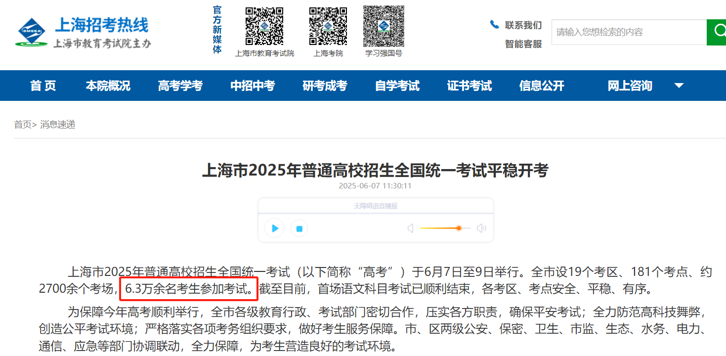 2025年上海高考共计6.3万余名考生参加考试,对比2025年增加9000人左右。