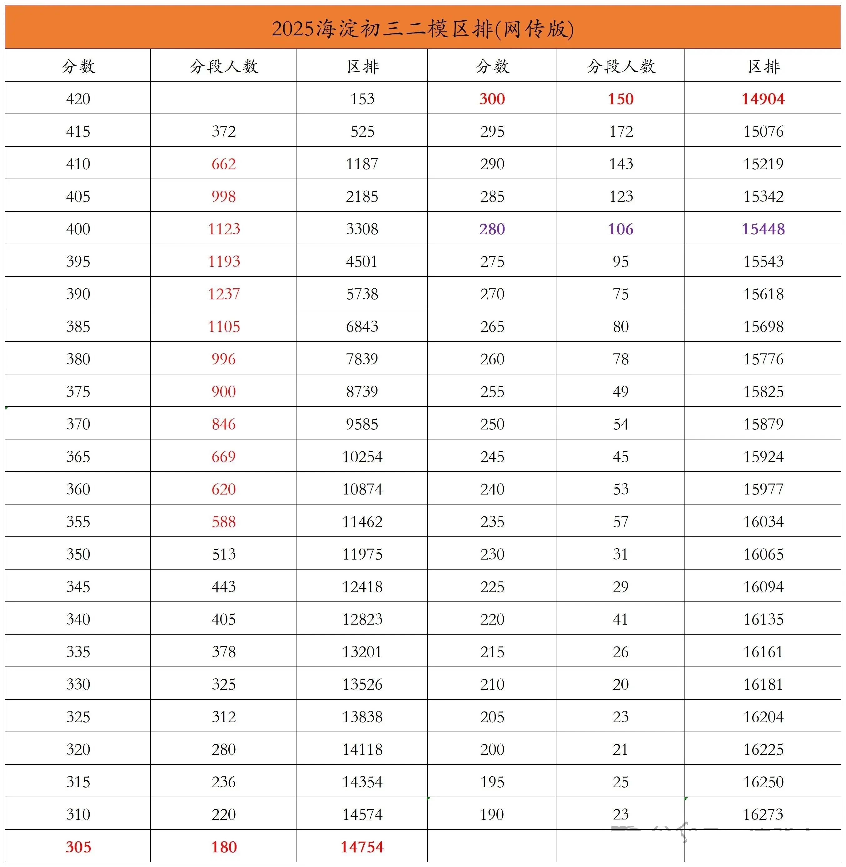2025北京海淀初三二模成绩区排名出炉,统计人数为16273人,400分以上有冲击小强校的机会,390分锁定第二梯队!300分左右的学生在中考公立普高边缘!