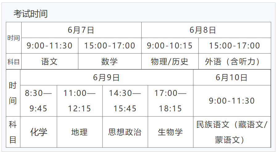 青海2025年高考时间为6月7日-10日,今年高考包括统一高考和普通高中学业水平选择性考试。统一高考科目为语文、数学、外语3门,选择性考试科目为思想政治、历史、地理、物理、化学、生物6门,考生须从历史、物理2门首选科目中选择1门,再从思想政...