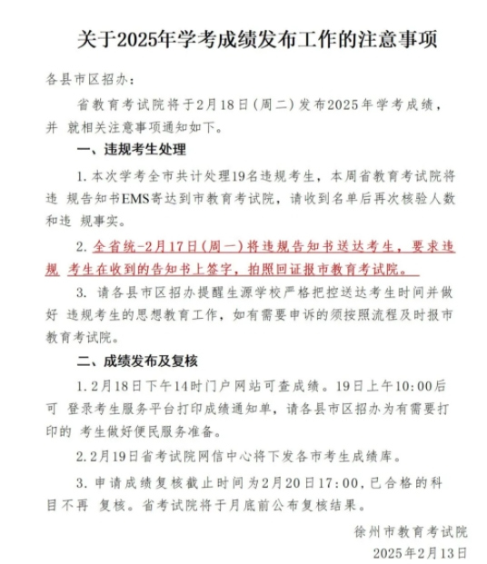 江苏省2025年普通高中学业水平合格性考试成绩将于2月18日14:00后向社会发布。考生可以登录江苏省教育考试院门户网站(www.jseea.cn)查询考试成绩。2月19日上午10:00后,考生可登录考生服务平台(gk.jseea.cn)自...