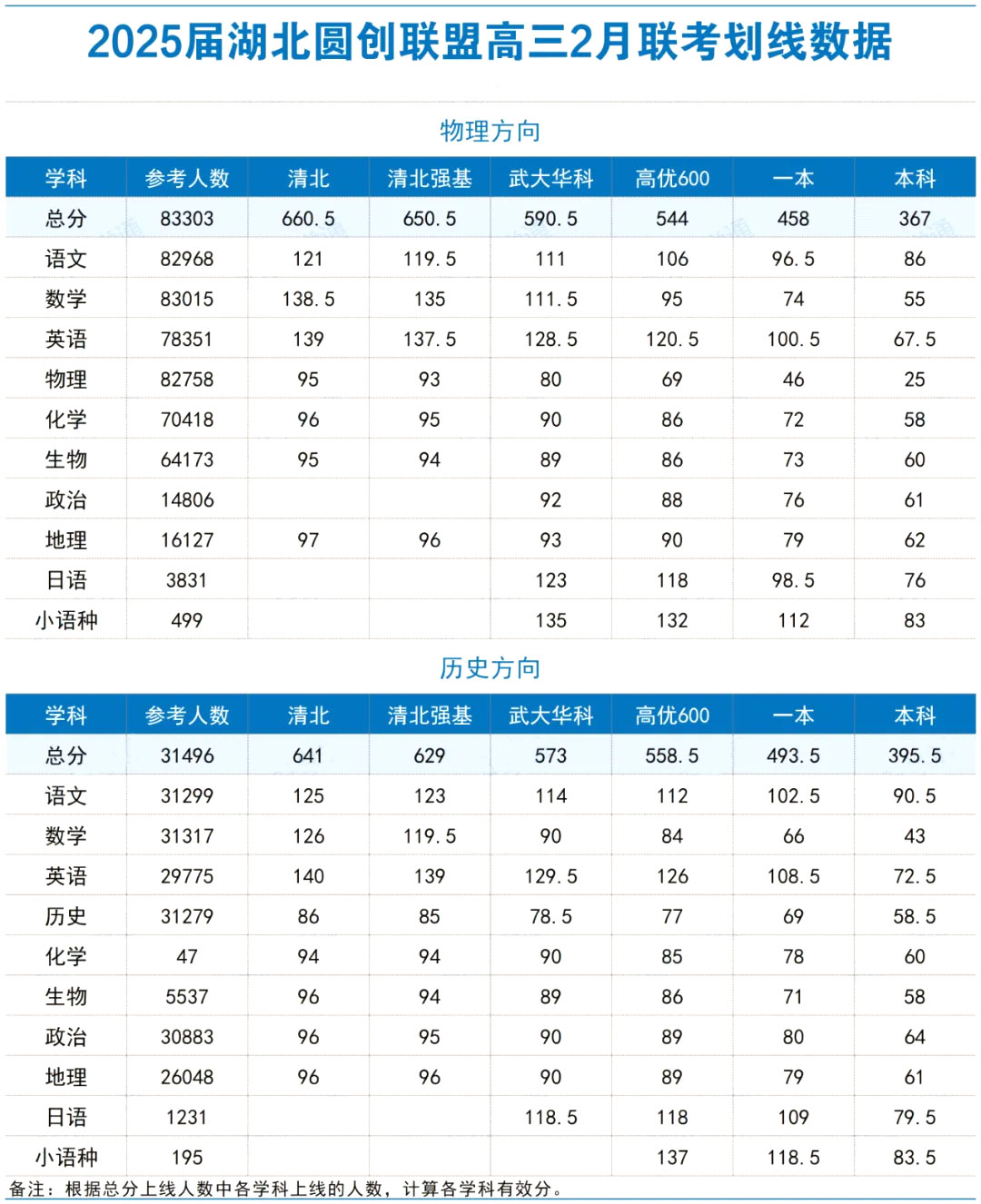 近日,湖北省2025届圆创联盟高三2月联考划线数据公布,此次联考全省150余所高中参与,参考物理考生83303人,历史考生31496人,共计有超11万考生参加,物理本科线367分,一本线458分;历史本科线395.5分,一本线493.5分。...