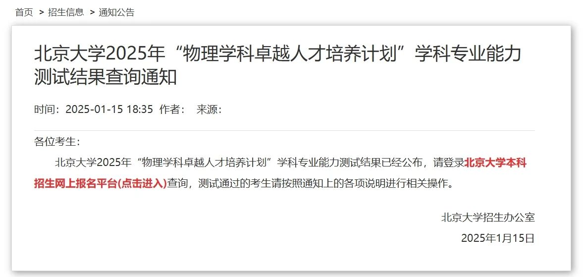 北京大学2025年“物理学科卓越人才培养计划”学科专业能力测试结果开放查询!2025年清北少年班的入围结果陆续公布,相信很多优秀的低年级考生家长也对少年班感兴趣,提前直通顶尖高校的机会实在有吸引力。查询通知:http...