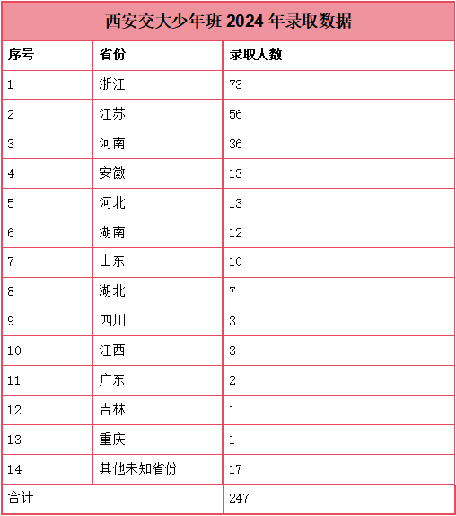 2024年参加初试笔试的有7000人左右,入围复试面试的差不多有1000人,最终拟录取名单约247人。2024年的数据反映了西安交大少年班招生选拔的严格,可以看出每一阶段的竞争还是很激烈的。
