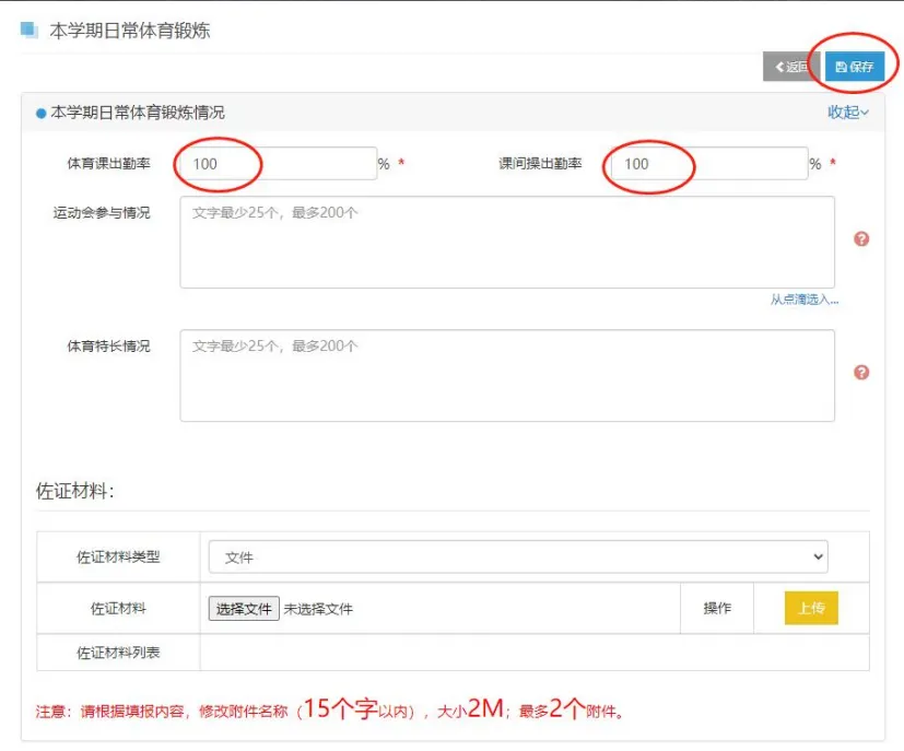 身心健康中的日常体育锻炼(必填):点添加后,“体育课出勤率”和“课间操出勤率”按实际出勤情况每学期填写数字即可,“运动会参与情况”和“体育特长情况”按实际参加情况填写,活动中获得荣誉的可上传佐证材料(获奖证书等的照片)。