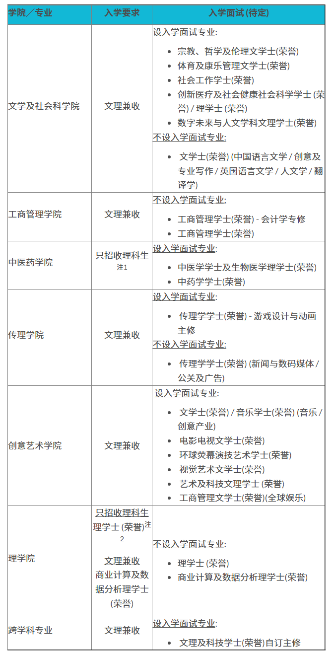 以下专业将另设入学面试作综合评估,有关各专业的面试安排,请细阅“专业概览”相关内容: