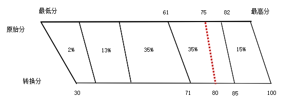 第二步,将A至E五个等级内的考生原始分,按照等比例转换规则,转换到100~86,85~71,70~56,55~41和40~30五个分数区间,根据转换公式计算,四舍五入取整数得到考生的等级转换分。转换后的成绩一分一档,考生排序不变。