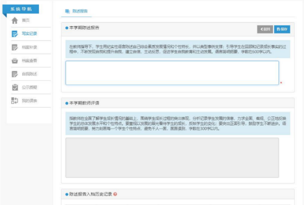 在填写完信息后,进去首页,学生可以在页面中查看个人的基本信息,往后需要包含思想品德、身心健康、艺术素养、社会实践在内的写实记录模块:以及学生档案画像、自我陈述等。