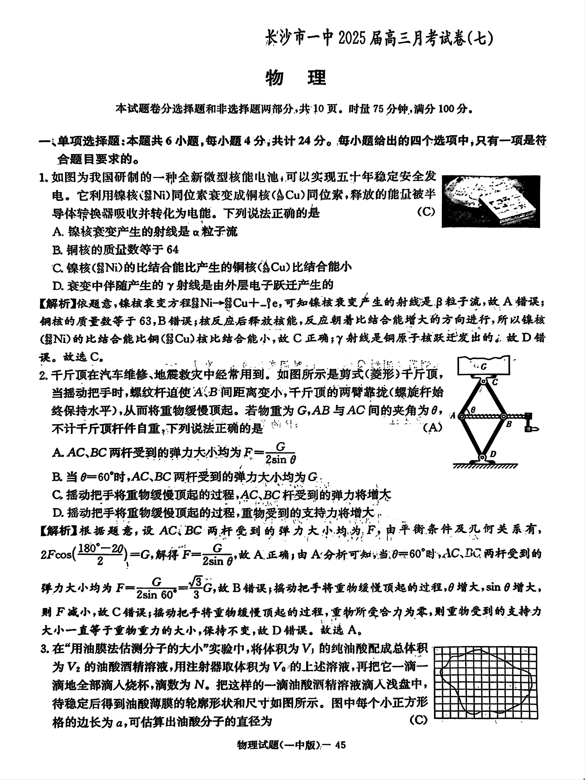 炎德英才湖南省长沙市第一中学2025届高三月考(七)物理试题及答案.pdf