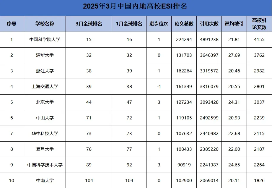 在2025年3月最新中国内地高校ESI排行榜中,中国科学院大学全球排名15名,继续保持内地高校第一,清华大学国际排名位居32位,位居国内高校第二位。浙江大学全球排名38名,居全国第三、上海交通大学全球排名39位,位列国内高校第四位,北京大学全球排名44名。中山大学、华中科技大学、复旦大学、中国科学技术大学全部位列全球高校前百。