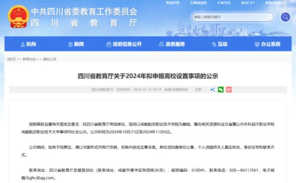 近日,四川省教育厅发布《关于2024年拟申报高校设置事项的公示》。按照高校设置有关规定及要求,经四川省教育厅党组审议,现将以成都航空职业技术学院为基础,整合相关资源拟设立省属公办本科层次职业学校成都航空职业技术大学事项向社会公示。